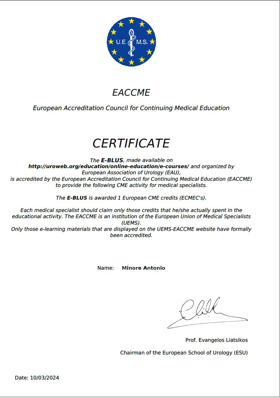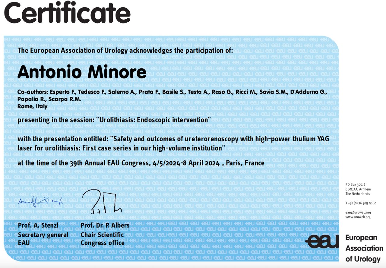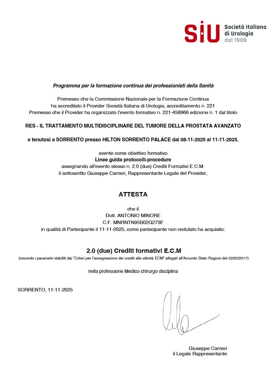 Nel 2026 mi sono specializzato presso la stessa università in Urologia con il massimo dei voti e attualmente sono un collaboratore del Centro Urologico Europeo (C.Ur.E.) ed esercito la mia attività in convenzione con il sistema sanitario nazionale presso il Tiberia Hospital a Roma. Il gruppo di cui faccio parte è composto da professionisti di grande esperienza con diverse subspecializzazioni nell'ambito urologico al fine di poter garantire ai pazienti un servizio di assistenza completo per le problematiche per cui si affidano a noi.
